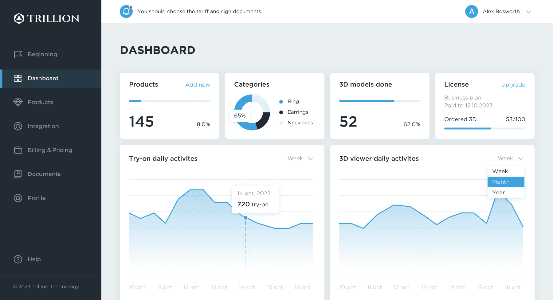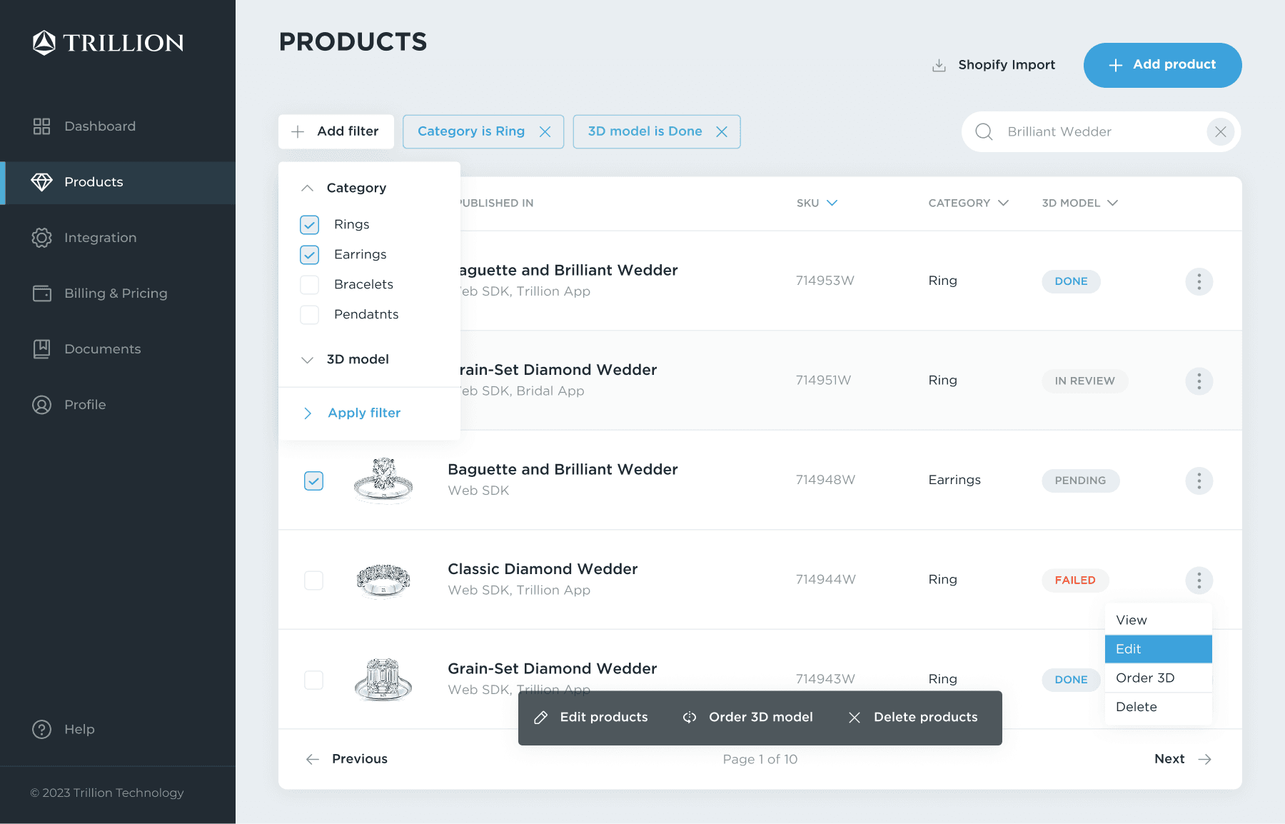 Trillion evolved into a clearer operating system for AR commerce: teams could monitor catalog readiness, manage 3D production, activate integrations, and evaluate viewer and try-on performance through a more consistent interface.